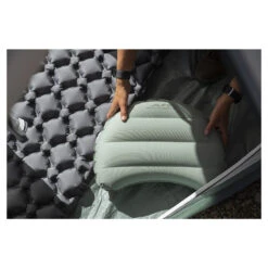 The ALPS Mountaineering Vice Pillow provides comfort and convenience in an environmentally friendly way. Made from recycled 30D polyester fabric in an attractive Iceberg Green. The soft brushed feel provides comfort and peaceful quiet when sleeping. The flat TPU valve allows for rapid inflation and deflation. When deflated, the Vice stores in the included small stuff sack also made from recycled material. The inflated size of 17” X 12” X 5” and arched shape make it a perfect fit to place in a hooded sleeping bag. Weighing on 3.8 ounces makes it perfect for trail hikes.